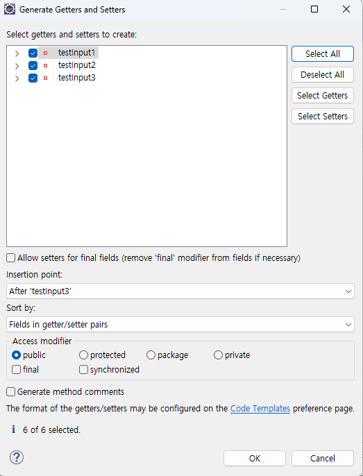 private ์ ์์ฑํ๋ค๋ฉด source > Generate Getters and Settings ๋ฅผ ๋๋ฅด๊ณ ,
