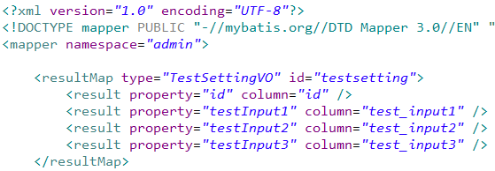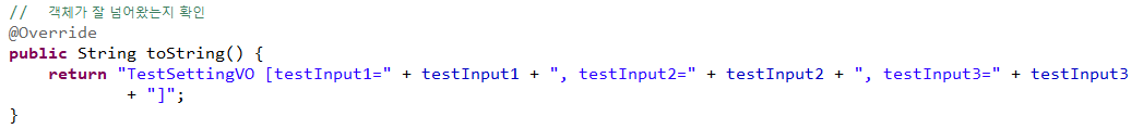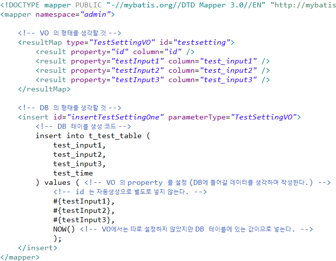 - ๋ฆฌ์์ค๋ก ๋ฐ์ private ๊ฐ์ฒด ์์ ์๋ insertTestSettingOne์ ํจ์๋ฅผ ๋ถ๋ฌ์ค๊ณ parameterType ์ผ๋ก ๋ฐ์ VO ์ ์ ์ฅ๋ String์ ๋ถ๋ฌ์จ๋ค.