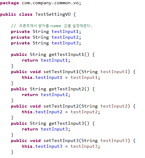 VO ์์ ์์ฑํ class ์์ ์๋์ ๊ฐ์ด ์์ฑํ๋ค.