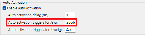 - Preferences > java > editor > content assist > .abcdefghijklmnouvwxyz ๋ฅผ ์