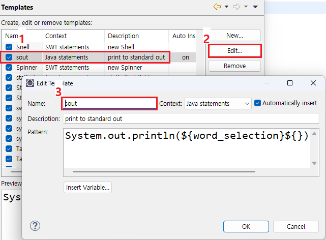 - Preferences > java > editor > templates > sout(์ธํ