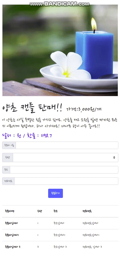 1) ์ฃผ๋ฌธํ๊ธฐ(POST): ์ ๋ณด ์ ๋ ฅ ํ '์ฃผ๋ฌธํ๊ธฐ' ๋ฒํผํด๋ฆญ ์ ์ฃผ๋ฌธ๋ชฉ๋ก์ ์ถ๊ฐ