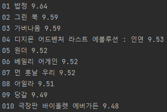 print(rank, title.text, star.text)