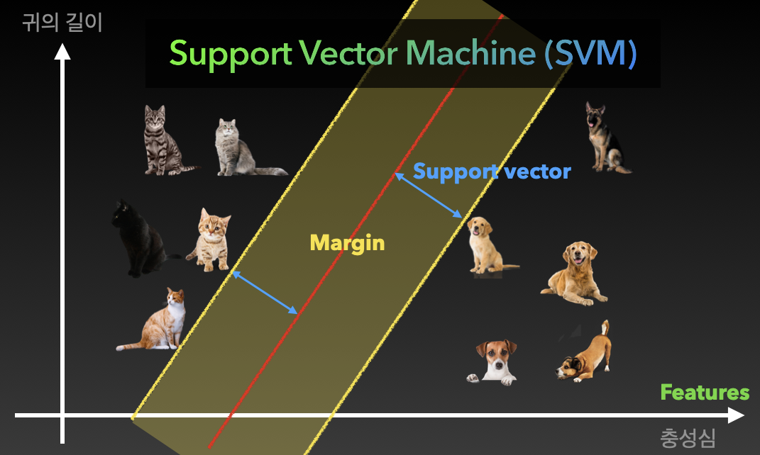 - ๊ทธ๋ํ์ ์ถ์ Feature(ํน์ง)๋ผ๊ณ ๋ถ๋ฅด๊ณ ๊ฐ ๊ณ ์์ด, ๊ฐ์์ง์ ์ฐ๋ฆฌ๊ฐ ๊ทธ๋ฆฐ ๋นจ๊ฐ ๋ฒกํฐ๋ฅผ Support vector, ๋ฒกํฐ์ ๊ฑฐ๋ฆฌ๋ฅผ Margin