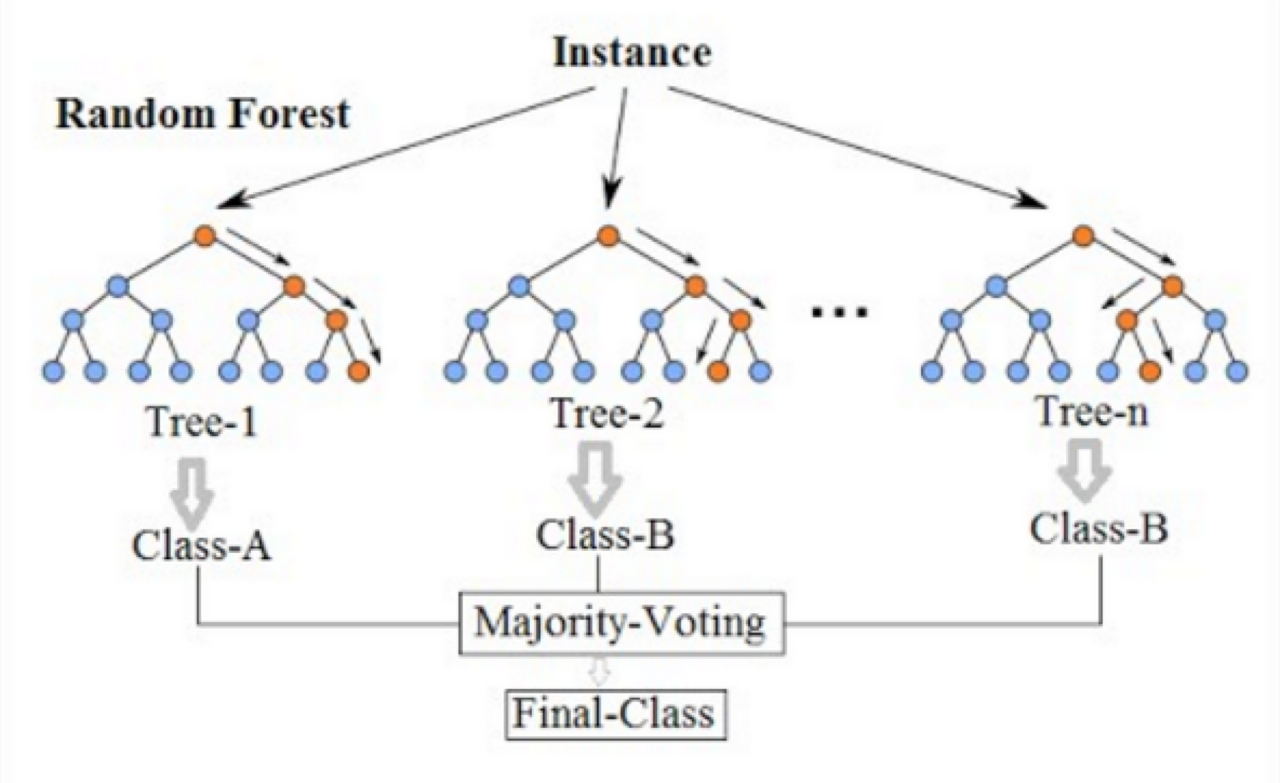 - ๊ฐ๊ฐ์ ์์ฌ๊ฒฐ์ ๋๋ฌด๋ค์ด ๊ฒฐ์ ์ ํ๊ณ ๋ง์ง๋ง์ ํฌํ(Majority voting)์ ํตํด ์ต์ข ๋ต์ ๊ฒฐ์