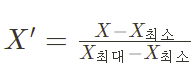 - ๊ฐ์ ํน์ฑ์ ๋ฐ์ดํฐ ์ค์์ ๊ฐ์ฅ ์์ ๊ฐ์ 0์ผ๋ก ๋ง๋ค๊ณ , ๊ฐ์ฅ ํฐ ๊ฐ์ 1๋ก ๋ง๋ฌ