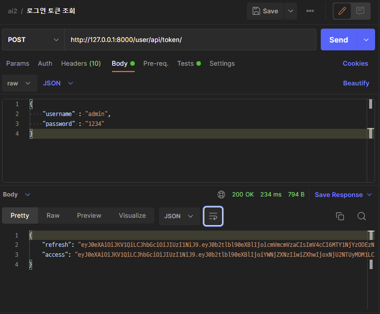 - user/api/token/ μΌλ‘ username κ³Ό password λ₯Ό λ΄μμ 보λ΄μ£ΌμΈμ.